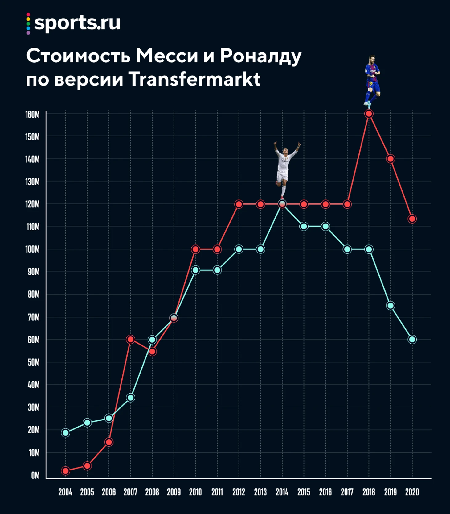 А вот как, кстати, на Transfermarkt менялась цена на Месси и Роналду в течение их карьеры.