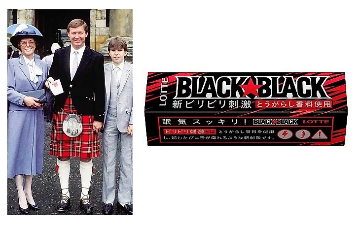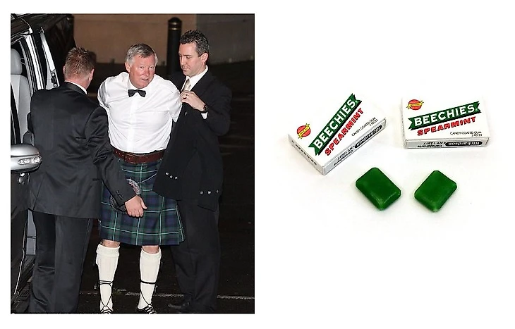 Сэр Алекс в килте и жевательная резинка почти с таким же узором.
