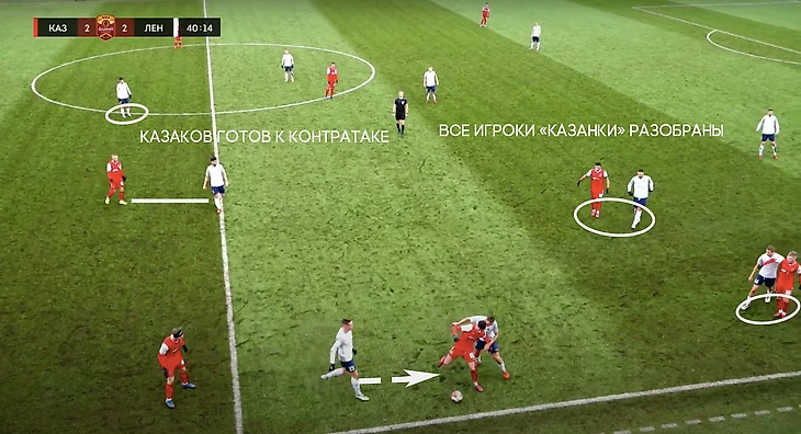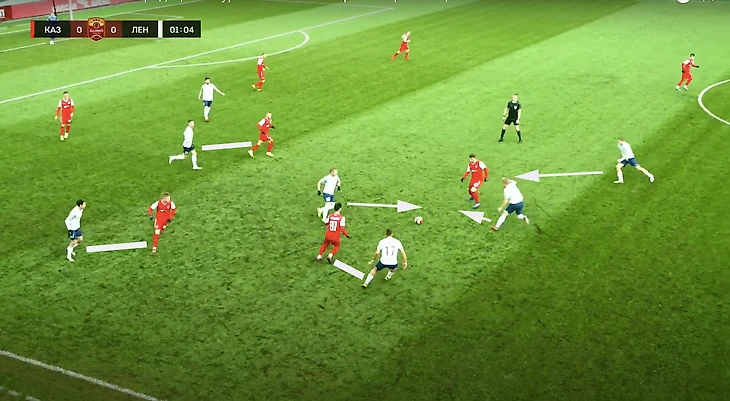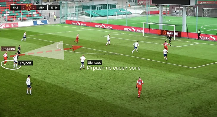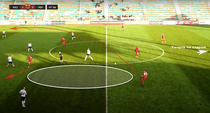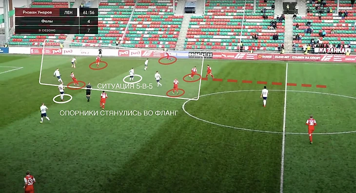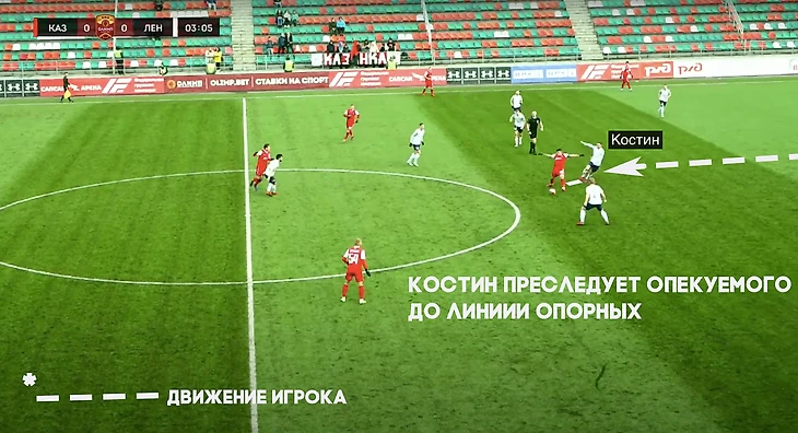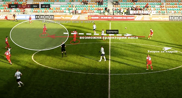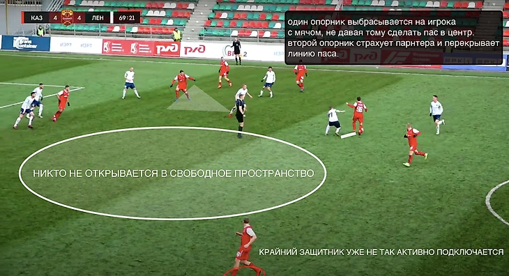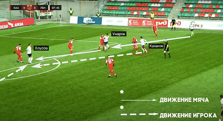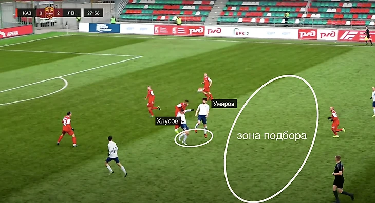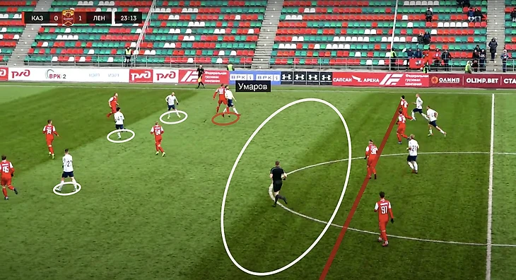 Слабая работа без мяча Умарова давала еще большее преимущество Казанке в центре поля. На центральных защитников соперника выбрасывались опорники Ленинградца, оставляя зону и своего игрока.