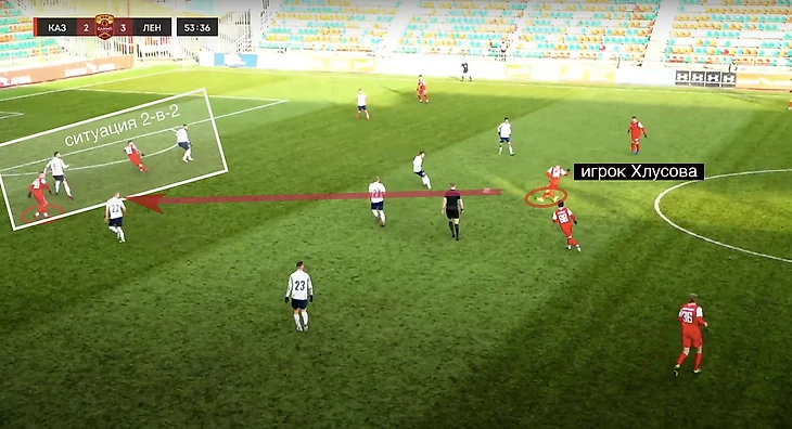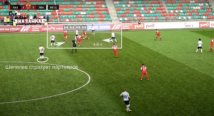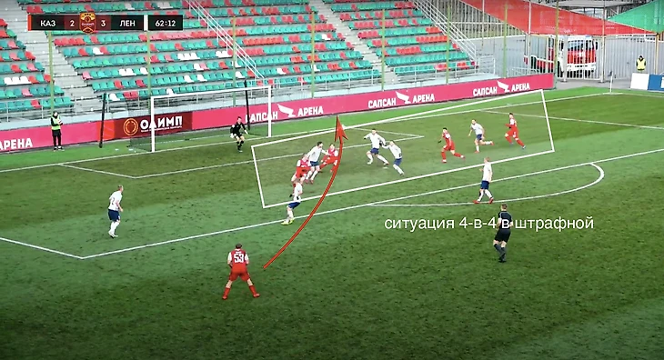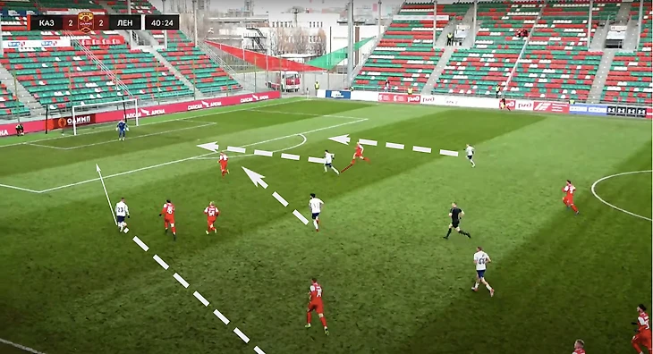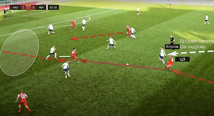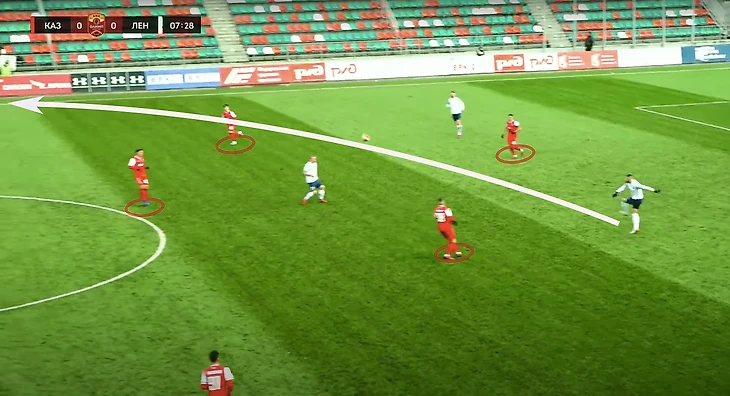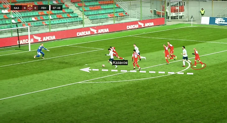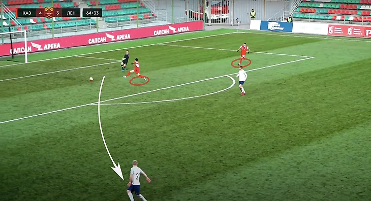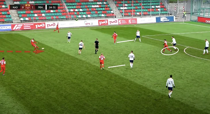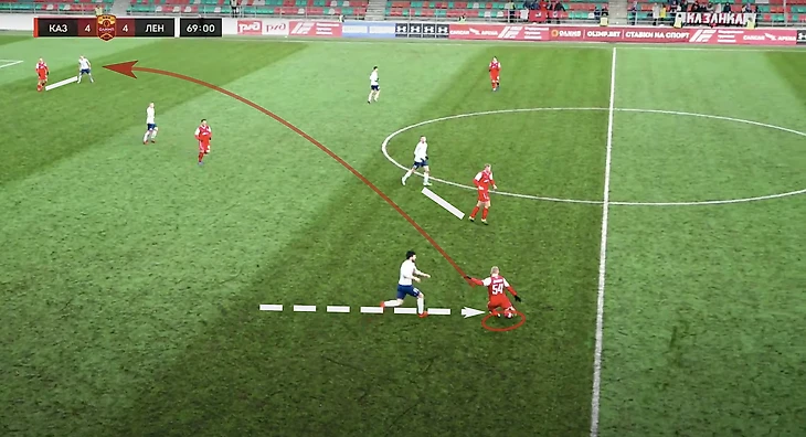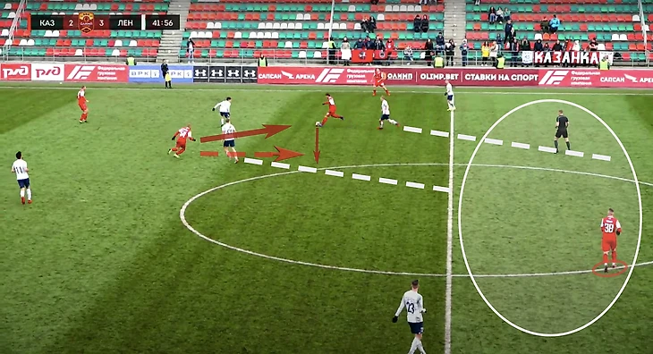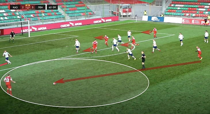 Третий гол в ворота Ленинградца начался именно с центрального защитника Казанки, который протащил мяч по правому полуфлангу очень глубоко без сопротивления. Отдал во фланг, где уже создавался перегруз зоны: все центральные полузащитники «Казанки» стянулись в эту зону и увели за собой опорников Ленинградца.