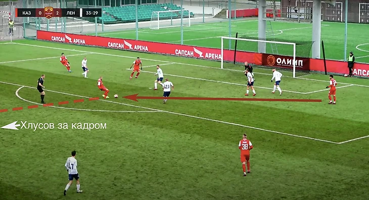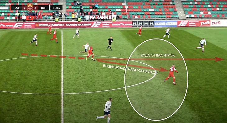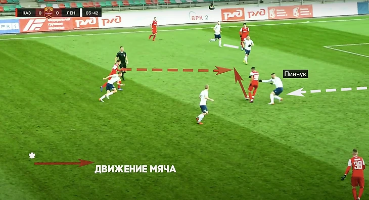 Хорошо, что защитник решил сделать диагональ, хотя у Казанки есть численное преимущество на правом полуфланге, куда смещается инсайд и просит мяч в ноги.