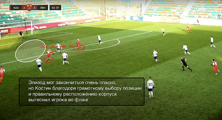 В следующем похожем эпизоде на защитника Казанки уже выбрасывался Хлусов, оставляя своего игрока (52го номера). Игрок с мячом успевает сделать хороший вертикальный пас на открывшегося между линиями инсайда (он вытащил за собой нашего левого защитника), который пасом на третьего находит того самого 52го номера в центре. Дальше идет проникающий пас в зону, которую своим движением освободил инсайд Казанки. Костин подстраховал партнеров.