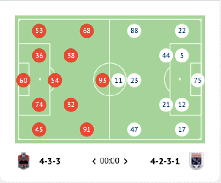 Наша команда придерживалась персонально-зональных ориентировок на своей трети (центральные защитники по форварду, опорники по восьмеркам, фуллбэки по инсайдам). Из-за этого центральные защитники очень высоко преследовали опекуемого форварда московской команды Сулейманова (№93).