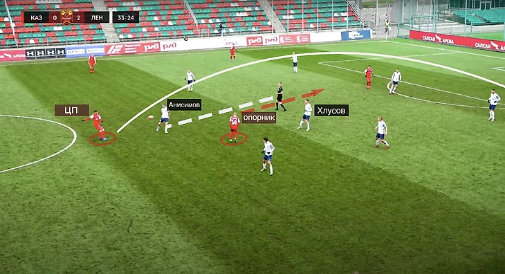 Опекун Анисимова меняется позицией с опорником и принимает мяч достаточно глубоко. По персональной ориентировке — это игрок нашего 44 номера, а по позиции — Хлусова. Наш опорник чувствует себя некомфортно в такой ситуации, так как вынужден выдергиваться со своей позиции и оголять центр поля. За эти мгновения свободы на мяче, пока Анисимов перестраивался, полузащитник Казанки успевает подготовить блестящий пас в коридор между центральным и крайним защитниками. Они не разобрались, кто должен играть по забегающему. 91 номер спокойно принял мяч в штрафной и покатил его в зону перед 11-метровой отметкой, как раз свободному игроку из центральной тройки полузащитников Казанки, за которым физически не успевал Анисимов, и не доиграл эпизод Хлусов, который в этом эпизоде даже не побежал за опекуемым прикрывать очень опасную зону.
