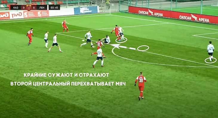 Оба опорных полузащитника вытянуты из своих зон, простая стеночка и они оба отрезаны. Перед игроком Казанки полностью свободное пространство в центре, где открывается их свободный центральный полузащитник.