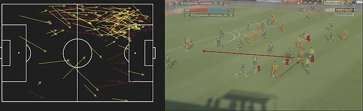 Излюбленной зоной для попытки пойти в обыгрыш в таком разрезе становится зона №1. В этом нет ничего критичного, хотя нельзя не учитывать скованность с двух сторон ( боковая и лицевая линии). Де-факто дриблинг здесь это улучшение момента для подачи/навеса. Такая картина свойственна «Арсеналу» — инвертированные вингеры Лесовой, Ломовицкий, ранее Бакаев могут убирать мяч в центр под удобную ногу. Другое дело эффективность такого приема.
