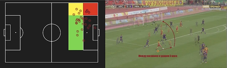 Ситуации с ударами стандартны для любого инвертированного вингера — ложное движение, уход в центр, удар с удобной ноги. Если исключить из выборки совсем нереалистичные попытки ( обозначены красной зоной ниже), то отчетливо проглядывается ориентированность Лесового на удар с подступов штрафной. Таким способом он еще не забивал, но справедливо предположение — однажды количество попыток перейдет в качество. Приблизить желанный момент должна дополнительная работа над техникой удара. Сейчас в 100% случаев Даниил старается бить с подкруткой в дальний угол. В динамике перехода из рваного темпа обыгрыша соперника к удару полузащитник «Арсенала» подходит к финальной фазе эпизода не в оптимальном положении: мяч настолько близко, что приходится бить из-под себя, не получается положить корпус, поставить опорную ногу для необходимой подкрутки, поэтому мяч летит по центру или слишком слабо для придания хоть какой-то опасности эпизода. Характерно, 48,3% ударов в сезоне идут в створ, но 29 ударов в совокупности дали лишь 2,04xG, а если вычесть оба гола ( которые были достаточно очевидными и от того «весят» более остальных), получается 27 ударов и 1,44xG, то есть вес одного удара около 0,05.
