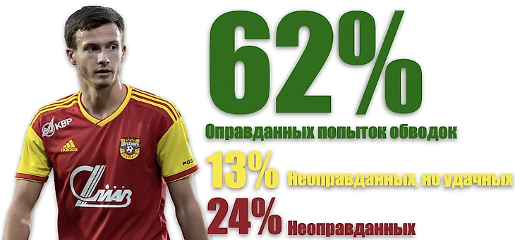 Поэтому, сформировав условную и максимально упрощенную таблицу — где есть лишь три поля, (1) оправданный дриблинг ( для случаев, когда рядом не было адресатов и/или они находились в менее выгодных позициях; Лесовой получал мяч в «закрытой» позиции, из которой передача куда-либо была невозможна; ситуация 1 в 1, которая предполагал сближение с соперником), (2) неоправданный, но удачный дриблинг, (3) неоправданный дриблинг — можно получить интересную картину: Даниил идет в дриблинг часто, очень часто ( более четверти от всех обводок «Арсенала», без Лесового тульский клуб был бы третьим с конца по попыткам продвинуть мяч за счет индивидуальных действий), но более половины из них вытекали из логики событий. Конечно, не без ложки дегтя — четверть обводок была не только неудачна, но и вовсе необязательна.