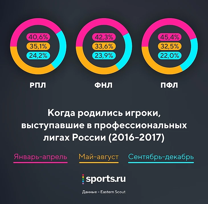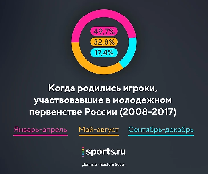 В молодежном первенстве России похожая ситуация. Лишь у трех команд игроков, родившихся во второй половине года, больше 40% («Крылья Советов» – 40,0%, «Тамбов» – 40,74%, «Урал – 47,22%). Меньше всех поздних игроков задействуют «Локомотив» и «Уфа» – по 8 футболистов из 36 (22,22%).