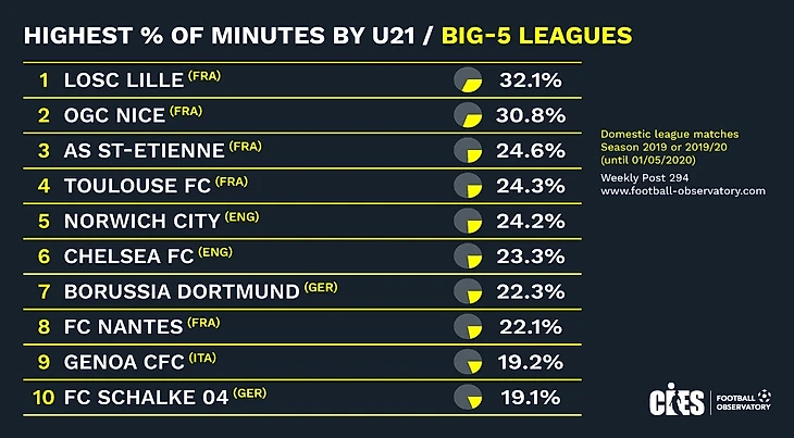 Лига 1, как всегда, на первом месте по доверию молодым игрокам. По исследованиям футбольной обсерватории CIES, в этом сезоне в Топ-5 лиг Европы "Лилль", "Ницца", "Сент-Этьен" и "Тулуза" доверяли больше остальных игрокам не старше 21 года.