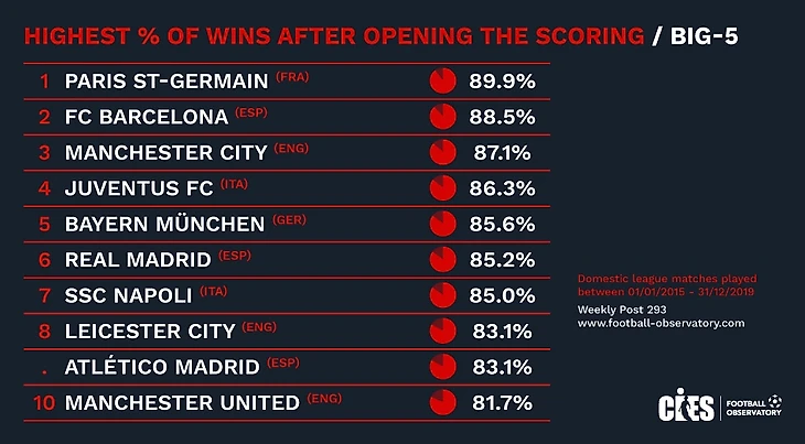 При этом ПСЖ является лучшей по этому показателю командой: с 2015 года в Лиге 1 "парижане" выиграл 124 из 128 матчей, в которых открывали счёт.