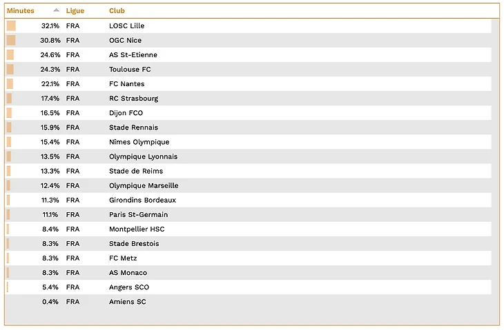 Рейтинг же чемпионата Франции по этому показателю выглядит следующим образом: