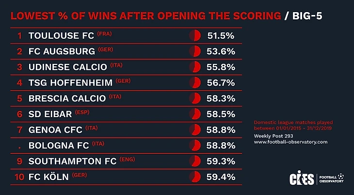 Кроме того, по исследованиям всё той же CIES, "Тулуза" возглавляет Топ-10 разочаровывающих команд за последние пять лет (клубы пяти ведущих европейских лиг). "Фиолетовые" выиграли только 35 из 68 матчей, в которых они открывали счёт.