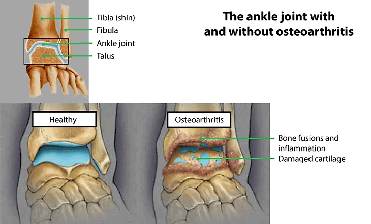 На рисунке выше слева здоровая нога, справа – пораженная остеоартрозом. Голубым нарисован хрящ. Поверхности сустава деформируются, жидкости все меньше, в итоге движения затрудняются, а из-за отсутствия «прокладки» кости трутся друг о друга, что и вызывает боль. С прогрессированием заболевания появляются костные наросты – остеофиты, которые дополнительно травмируют суставные поверхности, вызывая еще более сильную боль. Кроме того, крупные остеофиты могут препятствовать нормальному движению.