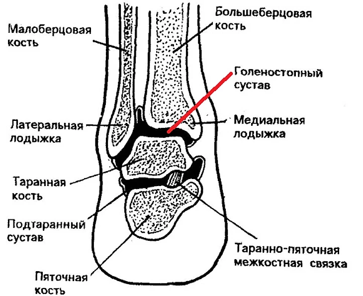 Немного анатомии. Голеностопный сустав образован таранной, малоберцовой и большеберцовой костью – выступающие части последних двух и есть латеральная и медиальная (наружная и внутренняя) лодыжки. Отдаленно это напоминает вилку, как иногда и называют этот сустав. На рисунке изображена схематично левая нога сзади.