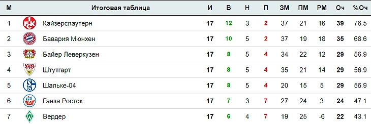 таблица Бундеслиги,после первого круга