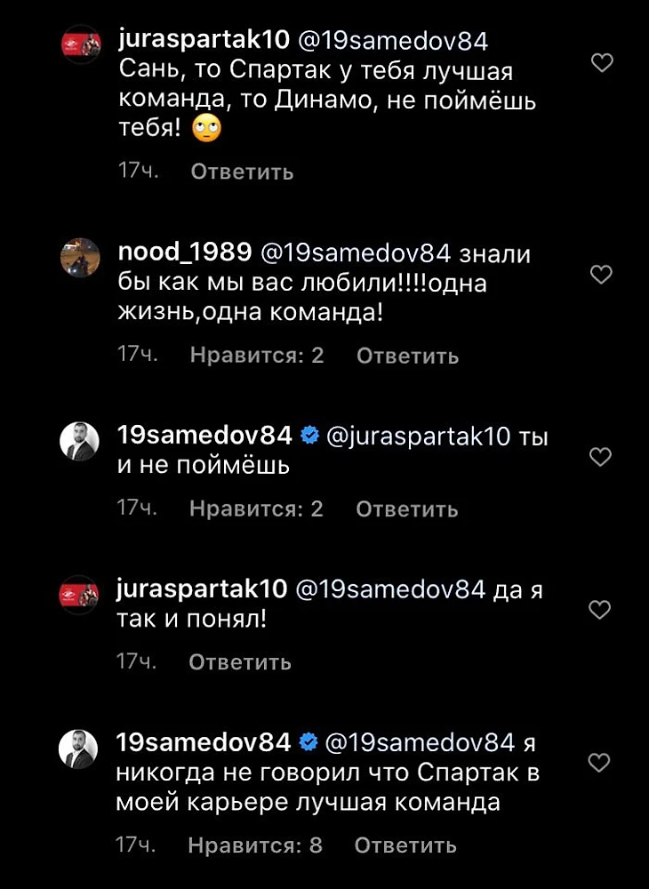 «Ты и не поймёшь. Я никогда не говорил, что «Спартак» в моей карьере — лучшая команда», — ответил подписчику Самедов.