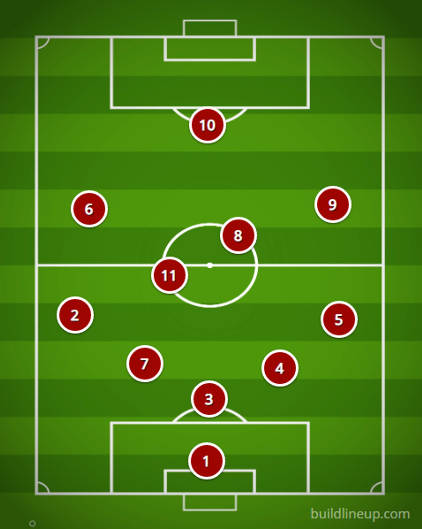 Красными линиями и пунктирными кругами изображена базовая формация, пунктирными линиями изображены передвижения при перестроении в ходе билд-апа, а синими линиями, полными кругами и синими кружками изображен результат билд-апа, тут можно увидеть позиции игроков при полноценной контратаке.