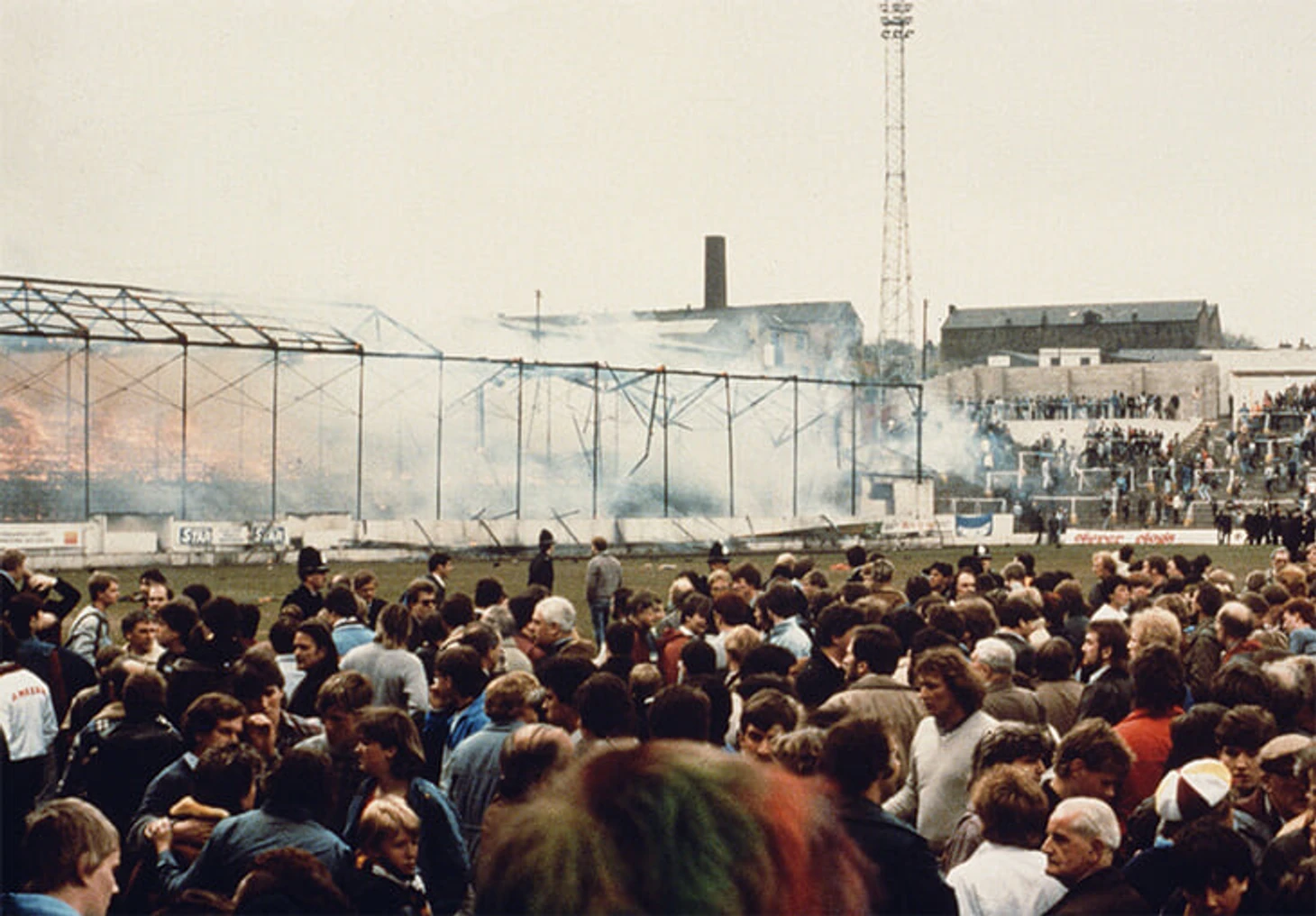Матч был важен для болельщиков. 11-го мая на «Вэлли Пэрейд» пришло чуть больше 11 тысяч зрителей (вдвое больше, чем обычно). Все они хотели поздравить команду с повышением, увидеть трофей и награждение. Когда первый тайм подходил к концу, на одной из трибун заметили оживление. Под ногами болельщиков нагрелся деревянный пол, а затем люди увидели языки пламени. Началась паника. Кто-то побежал на поле, что спасло им жизнь. Некоторые направились к выходу из сектора, где большинство из них задохнулось в тоннеле перед запертыми воротами.