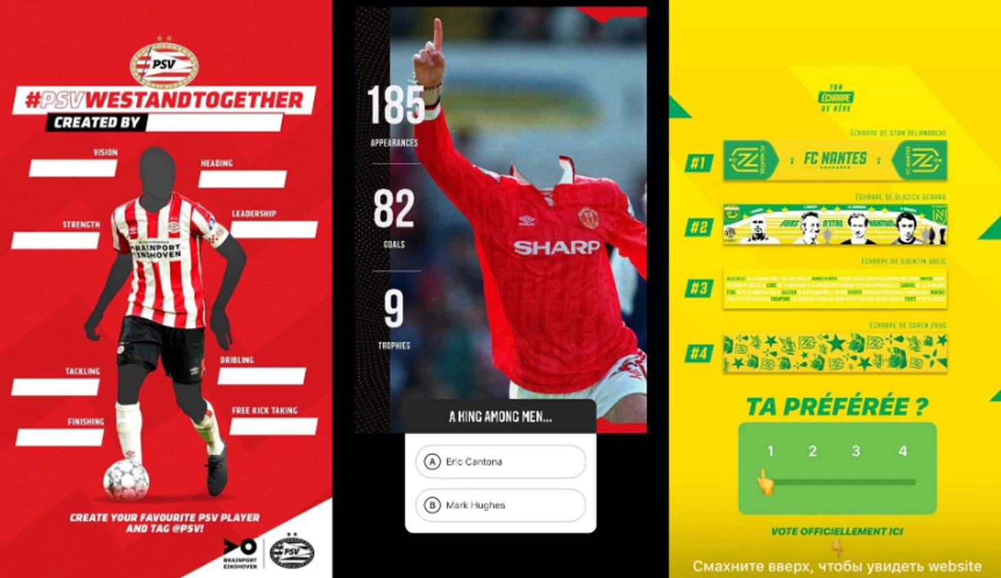 Несколько примеров интерактивного взаимодействия с болельщиками от разных клубов Европы. «ПСВ» предлагает отметить на картинке главного лидера клуба, лучшего нападающего, лучшего игрока головой и так далее. Несколько кровожадная иллюстрация от «Манчестер Юнайтед» – нужно угадать игрока, который в прямом смысле потерял голову. За счет такой реализации идея выделяется на фоне других подобных и привлекает внимание. Наконец, французский «Нант» предлагает фанатам определить дизайн нового клубного шарфа – гениальная идея, которая и вовлекает болельщиков, и предоставляет клубу готовое маркетинговое исследование.