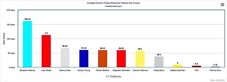 Мы очень часто слышим эту историю, но так ли это? Чтобы оценить, насколько эта информация правдива, мы сравнили количество дней, пропущенных за сезон из-за травмы Люка Шоу с другими знаменитыми защитниками. В подборку фуллбеков, используемых для сравнения, входят экс-игроки "Юнайтед", другие игроки из ТОП-6 Английской Премьер Лиги на этой позиции, а также Гримальдо.