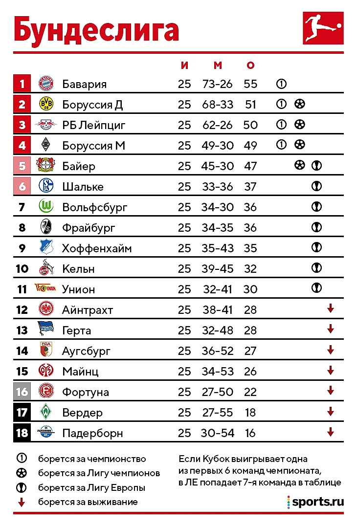 До карантина «Леверкузен» шел на лучший второй круг в клубной истории (7 побед в 9 играх). «Байер» оторвался на 10 очков от преследователей («Шальке», «Вольфсбург», «Фрайбург») и занимает сейчас пятое место. В двух очках перед ним – «Гладбах» и зона Лиги чемпионов. «Лейпциг» (+3 очка) и «Дортмунд» (+4) тоже рядом.