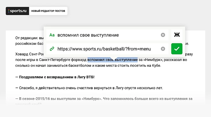 Теперь в отдельном поп-апе можно сразу и добавить или изменить ссылку, и изменить текст, по которому будет происходить переход, и добавить выделение полужирным начертанием, если ссылку нужно выделить дополнительно.