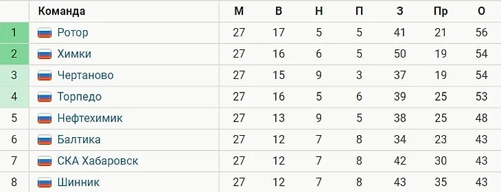 «Химки» и «Чертаново» набрали очков поровну – по 54. Команда Сергея Юрана выше за счет личных встреч – в одном из последних матчей при Андрее Талалаеве химчане обыграли «Чертаново».