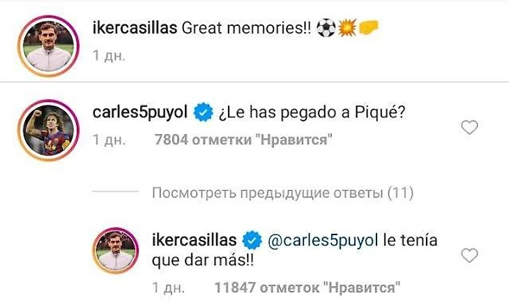 В комментариях к фотографии отметился экс-капитан «Барселоны» Карлес Пуйоль с комментарием: «Ты избил Пике?». После чего между Касильясом и Пуйолем состоялся следующий диалог