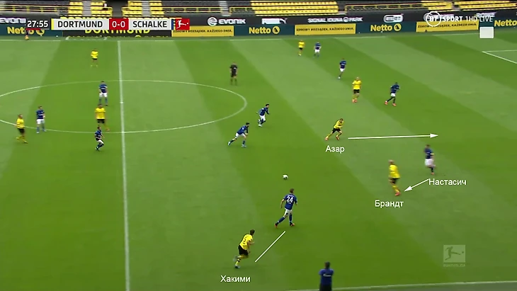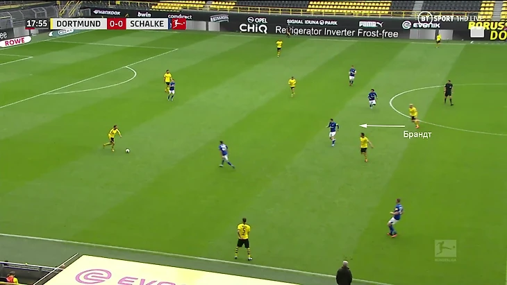 Брандт – один из самых недооцененных игроков в этом составе «Боруссии». Именно с изменением его роли и переходом на схему 3-4-2-1 связан почти весь позитив в атакующей игре команды. Обычно он появлялся рядом с Акселем Витцелем в опорной и связывал игру. Вчера его позиция была другой (играл выше, на одной линии с Азаром), но функции сохранились.