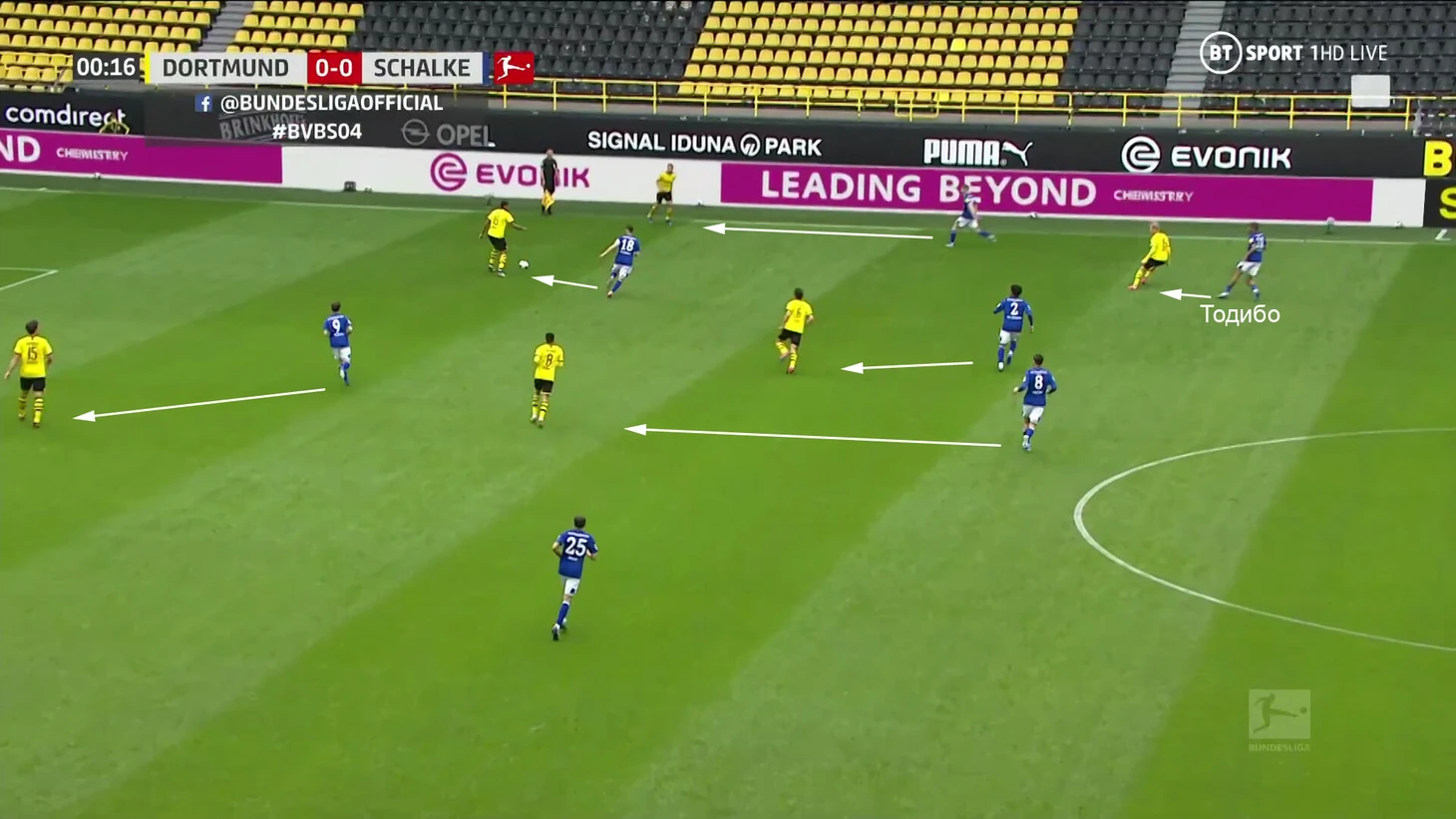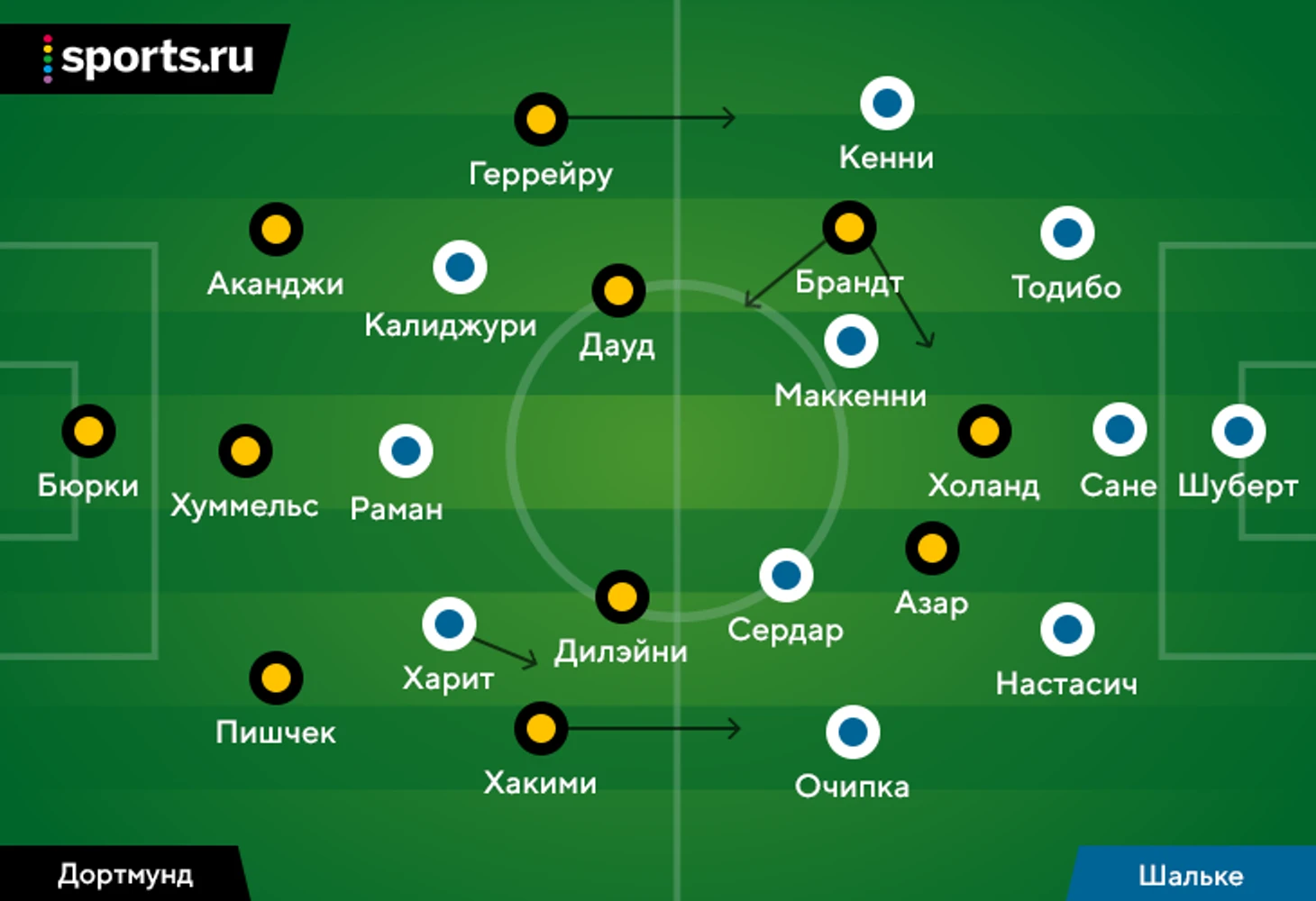 Описанные преимущества решили исход в пользу «Дортмунда» еще в первом тайме. Но Вагнер все-таки предпринял отчаянную, но интересную попытку пойти ва-банк. После его перестановок в перерыве «Шальке» расположился по схеме 4-4-2 в максимально атакующей конфигурации: 1) четверка защитников с активными подключениями крайних; 2) открытый центр из Харита и Маккенни – на практике Харит шел ближе к форвардам, а Маккенни часто оставался один; 3) постоянное наличие двух нападающих – Рабби Матондо и Гвидо Бургшталлер.