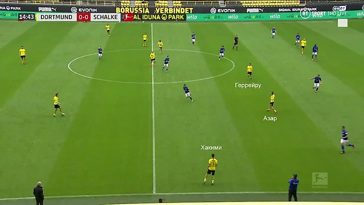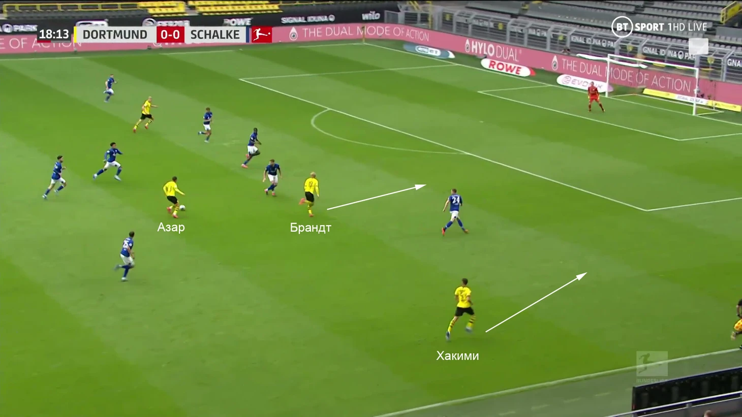 Команда Фавра достаточно быстро распознала уязвимую зону «Шальке». Тот самый гибридный фланг, где многое сводилось к решениям Харита. «Дортмунд» легко продвигал мяч через правый фланг, потому что соперник не разобрался, кто играет против Ашрафа Хакими (в разных эпизодах играли Харит или Очипка, а иногда – никто).