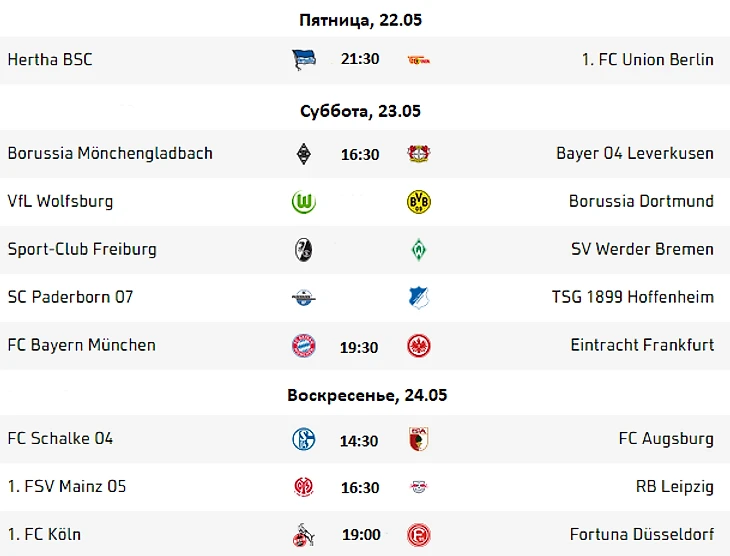 Вторые игровые выходные в Германии после карантина открываются берлинским дерби, которое в первом круге еще при своей публике выиграл дебютант Бундеслиги. В субботу нас ждет битва гладбахской «Боруссии» и «Байера» за места в топ-4, а также центральным матчем «Бавария» с «Айнтрахтом». На воскресенье же остались «Шальке», «РБ Лейпциг» и «Кельн».