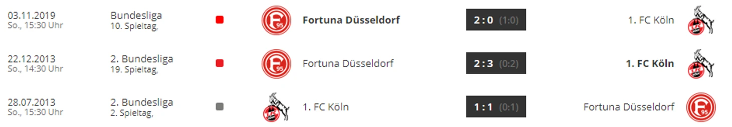 Лучший бомбардир Дюссельдорфа Хеннингс, на счету которого 11 голов, не может забить на протяжении девяти матчей. Однако в первом круге поразить ворота «Кельна» ему удалось, и матч закончился победой «Фортуны» 2:0.