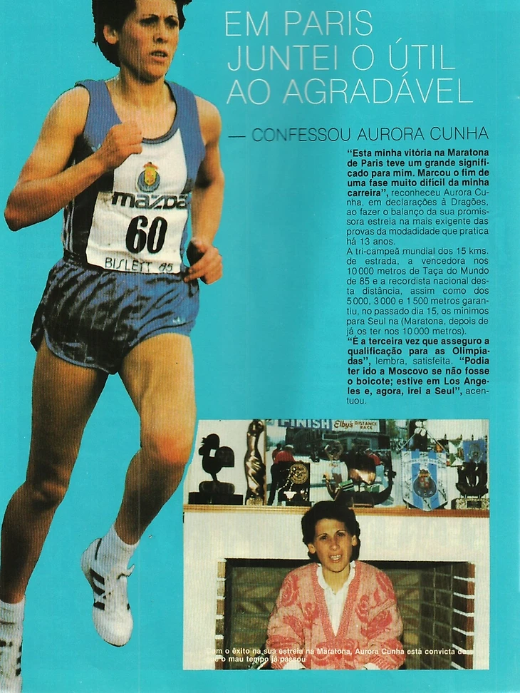 Также, в этот день, 32 года назад Аврора Кунья дебютировала в марафоне в отличном стиле: на международном марафоне в Париже, среди некоторых лучших атлетов того времени, она заняла первое место среди женщин со временем 2:35:55, что позволило ей принять участие в XXIV летних Олимпийских Играх 1988 года, в Сеуле.