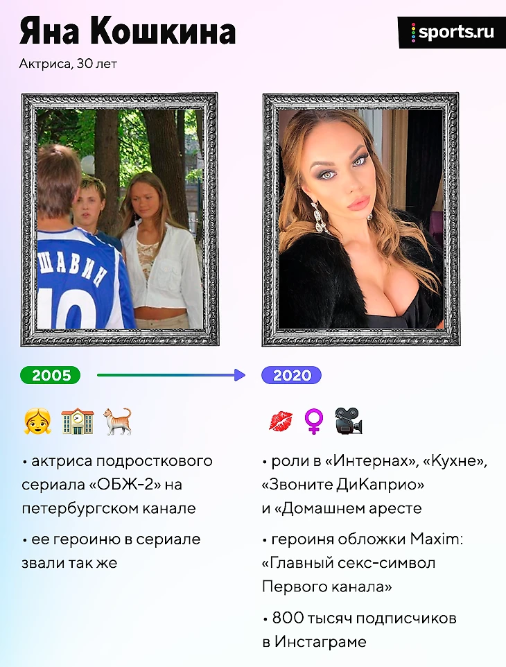Максим Демченко уже упомянул Яну Кошкину. Она постоянно снималась в «ОБЖ», в серии с Аршавиным именно ее внимания не хватает главному герою, она мотивирует Глеба усилить команду и помогает договориться со звездой «Зенита». Сейчас, через 15 лет в резюме Яны Кошкиной «Интерны», «Молодежка», «Кухня», «Звоните ДиКаприо» и «Домашний арест», шоу «Короли фанеры» на Первом вместе с Прилучным и обложка Maxim с заголовком «Главный секс-символ Первого канала».