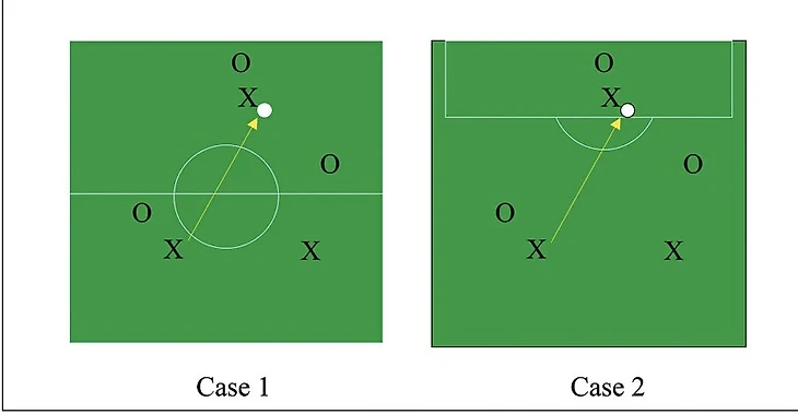 Но и статистический анализ может больше вредить, чем приносить пользы, если ведется только подсчет, а не анализ действий. На диаграмме ниже представлены передачи, которые можно оценить одинаково, ведь совпадает и расположение игроков, и траектория передачи, и ее успешность, но изменение положения на поле кардинально изменяет оценку передачи.