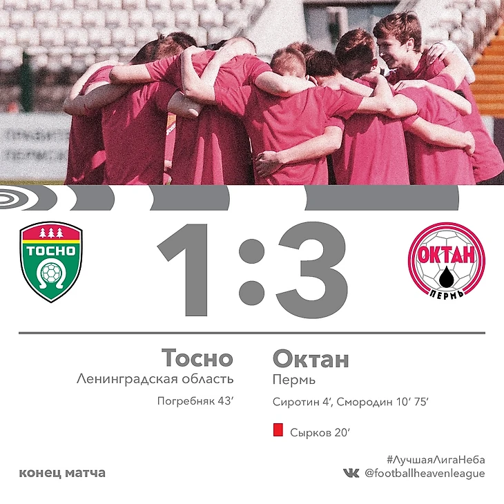 Хозяева поля последними двумя играми внушили слабенький оптимизм в сердца своих поклонников, несмотря на в целом с треском проваленный регулярный сезон. Но в гости к квартирующим в Тихвине черно-белым приехала машина для убийств, именуемая Октан (Пермь). Команда, практически без изменений в составе прошедшая сквозь всю регулярку лишь с единицей в графе "поражения", была полна решимости доказать далекому Камышину, что первое место должно быть за Пермью. Сразу гости ринулись на ворота Юрченко, и уже на 4 минуте после затяжного штурма Сиротин головой пробил с отскоком от газона. 11 минута показала, что шансов у хозяев не будет - перехват в центре поля, Сиротин выкатывает на Смородина, а пермский голеадор во второй раз доказал - Октан приехал только за тремя очками! 20 минута преподнесла неприятный сюрприз пермякам, с поля был удален левый крайний защитник Сырков, и со временем хозяева очухались, став все более опасно напирать на владения Шумайлова, на 43 минуте Мирзов выкатил на отклеившегося от защитников Погребняка, и тот катнул в дальний от Шумайлова угол. Разница в счете изменилась, но тосненцы после перерыва опять стали играть в унылый футбол с дырами в обороне, прижались к канатам и на 76 минуте все тот же Смородин в касание технично перевел мяч в сетку ворот Юрченко. Теперь Октану оставалось всего лишь наблюдать за ходом противостояния Сибири и Москвы. ОКТАН - ПОБЕДИТЕЛЬ ГРУППЫ D! ПОЗДРАВЛЯЕМ!