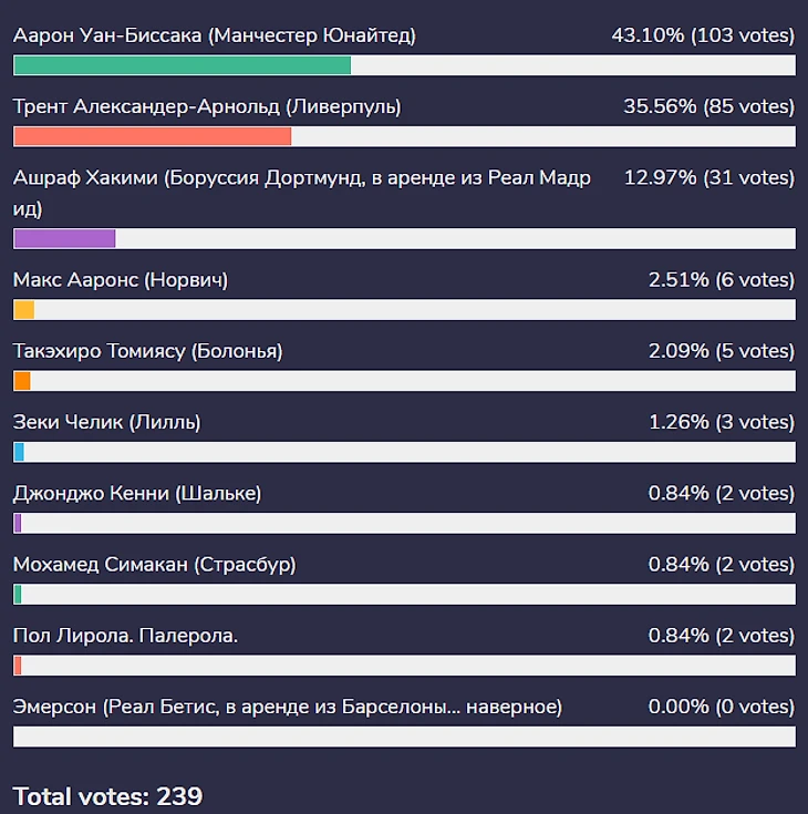 В голосовании по правым защитникам был просто фурор: 239 проголосовавших. Притом голосов 60 залетели за Аарона Уан-Биссаку буквально за одну ночь. Так что можно смело признать, что этот скромный полл подвергся рейду, что даже приятно) Так что голосуй или проиграешь!
