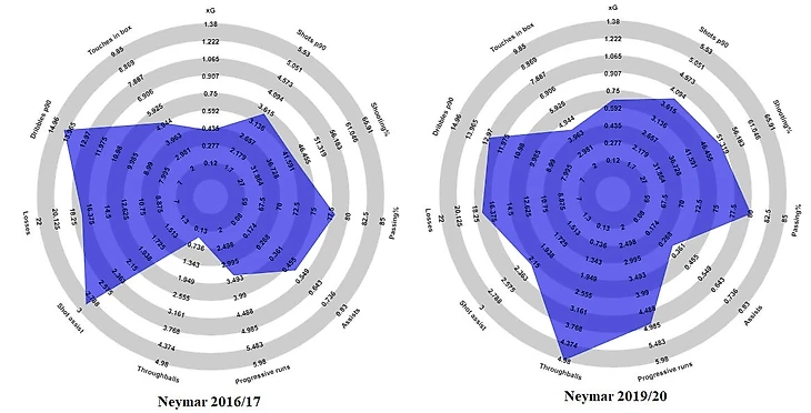 И хотя сейчас, возможно, он более опасен для оппонентов, чем раньше — эта опасность построена на совершенно иных принципах игры. Эти изменения отлично отображены на графике ниже, где сравнивается последний сезон Неймара в «Барселоне» и нынешний сезон в ПСЖ.