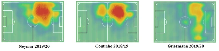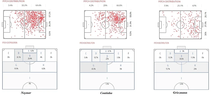 Коутиньо предпочитает действовать из глубины: игрок, который эффективен, когда есть свобода на фланге и под нападающим в роли десятки. Гризманн же максимально эффективен в роли второго нападающего, но в равной степени использует свободные зоны как во всей последней трети, так и внутри штрафной.