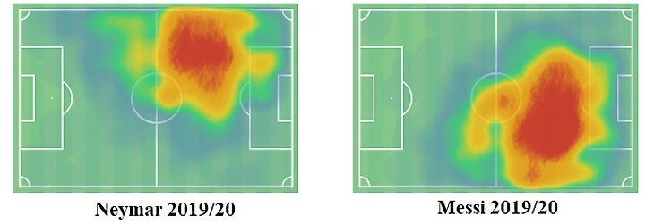 Тепловые карты показывают аналогичную картину. Конечно, радиус и область действия Месси немного больше, чем у Неймара, он действует на гораздо большей площади как внутри штрафной, так и в более глубоких зонах поля. Но траектория перемещения и расположение довольно схожи, разнятся лишь только стороны поля, где происходит движение.
