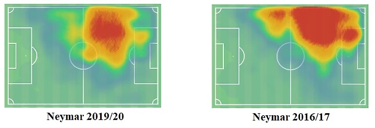 У старой версии Неймара, наоборот, была тенденция держаться флангов, поддерживая атаку по всей ширине поля. Но его тактическая модель с тех пор изменилась. Уходя от роли форварда, он все чаще играет плеймейкера и теперь держится более глубоко и ближе к центральной оси, как было отмечено ранее.