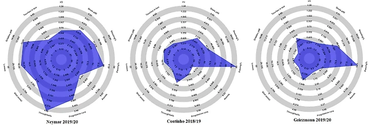 Хотя в общем и целом, карты Неймара и Коутиньо выглядят довольно схожими, визуально первый покрывает больший объем площади чем второй, а это значит, что он в своей роли более свободен. Это может быть обусловлено системой, в которой он играет или инициативой игрока на поле.