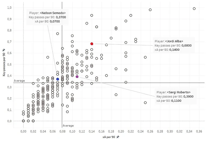 Но если взглянуть на защиту «блауграны», то только Жорди Альба, по количеству ключевых передач и ожидаемым голевым передачам, соответствует уровню топовых защитников пяти лучших чемпионатов Европы.