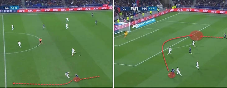 На изображении ниже продемонстрирована ситуация, когда бразилец воздерживается от забега в свободную зону за линией обороны соперника и решается идти в обыгрыш, улучшив тем самым позицию товарища по команде.