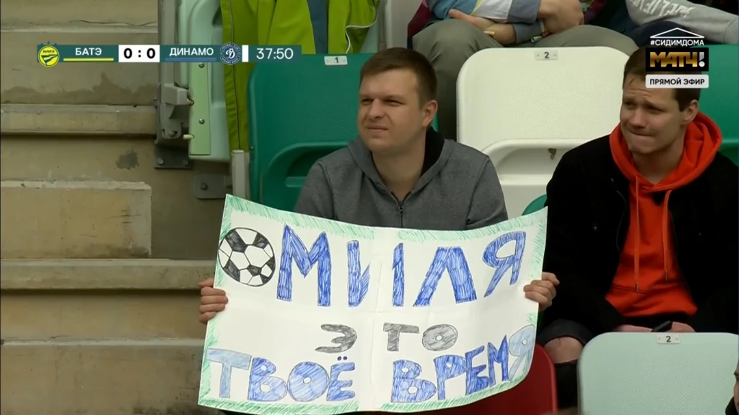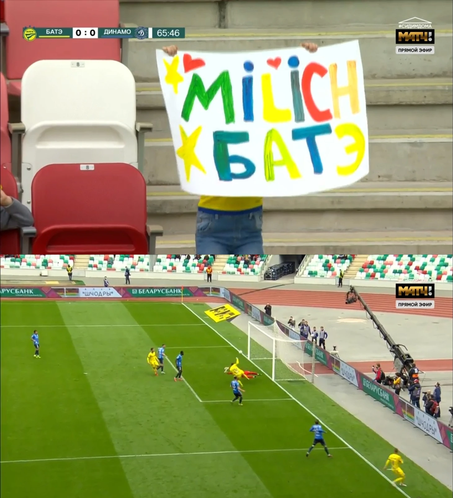 Альшевскому эта история совсем не нравится, потому что команда сидит на своей половине поля, не проявляя никакой инициативы. Но джокер в рукаве есть – и вместо совсем потерявшегося Нехайчика выходит на его позицию Милич. И тут же чуть не забивает. Может, его так подстегнул плакат (да сколько их тут вообще)? Но после прострела первым касанием серб едва не забивает.