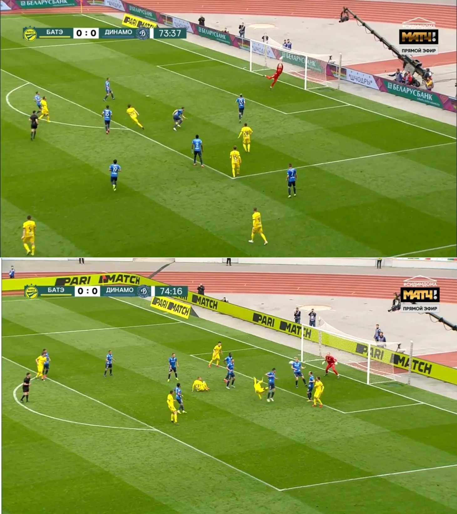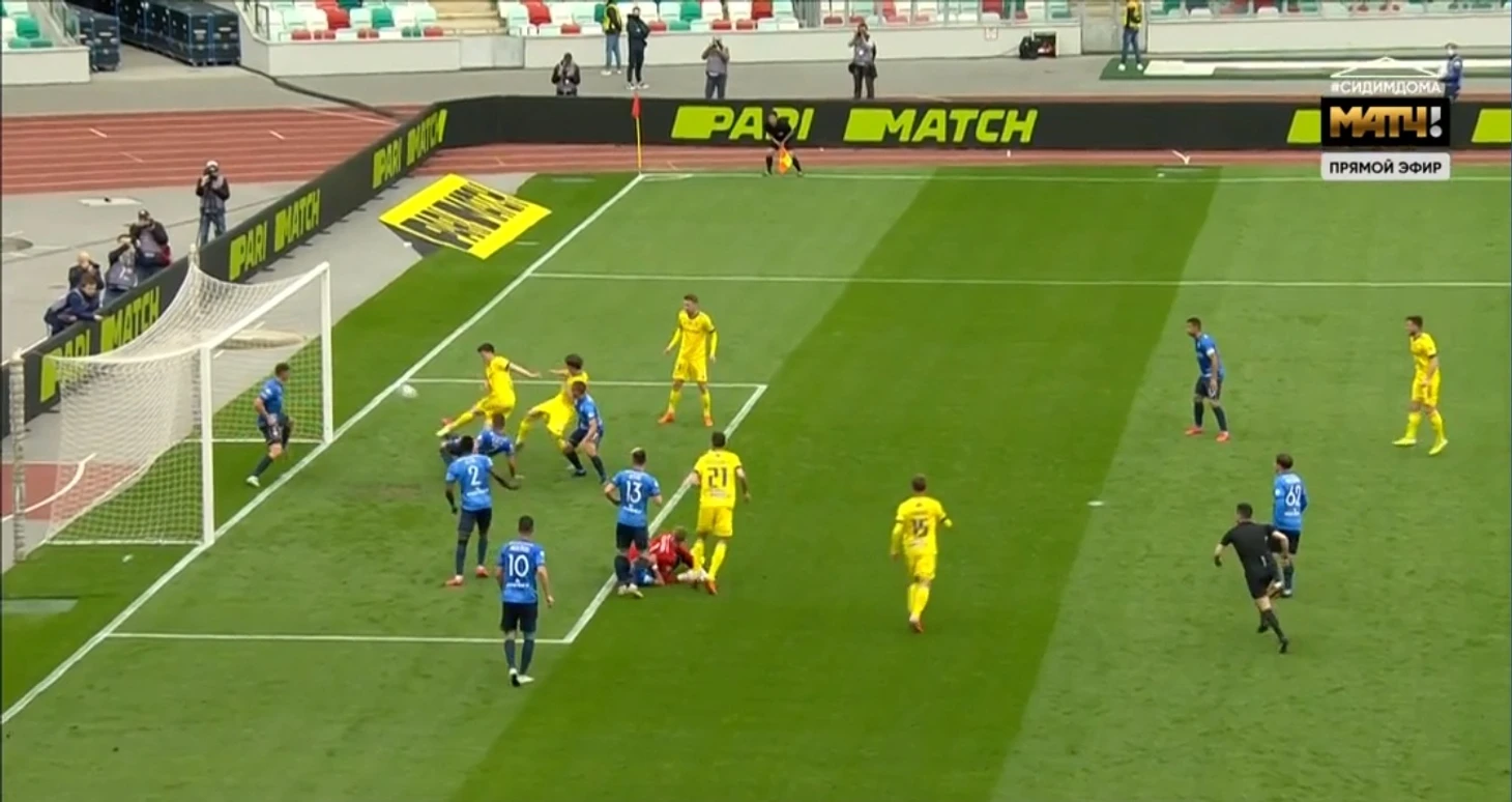 Брест тупо выбивает мяч. Борисов решает на последних минутах брать их ворота самым проверенным способом – угловыми.