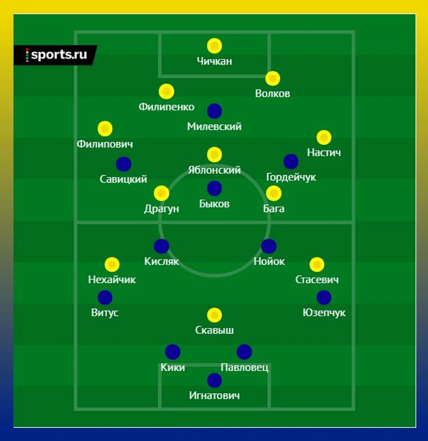 Вообще матч начался просто прекрасно. И преимуществом сразу завладело «Динамо». Потому что выбрало тактику прессинга на чужой половине поля. Они так загнали БАТЭ, что борисовчане не могли со своей половины выйти нормально. Этому способствовала интересная тактика – «Динамо» при защите и прессинге играло по схеме 4-4-2. Что выделялось: 1) в пару к Милевскому поднимался Быков, игравший на одной линии с Артемом; 2) зная, какую опасность несут фланговые защитники БАТЭ (а Филипович и особенно Настич – лучшие латерали Беларуси), изначально фланговые форварды Гордейчук и Савицкий опускались на одну линию с центральными хавбеками, и таким образом получалась классическая английская схема. В моменты прессинга, пожалуй, это превращалось в 4-2-2-2, но когда БАТЭ переходил чужую половину поля, все было сверху прекрасно видно.