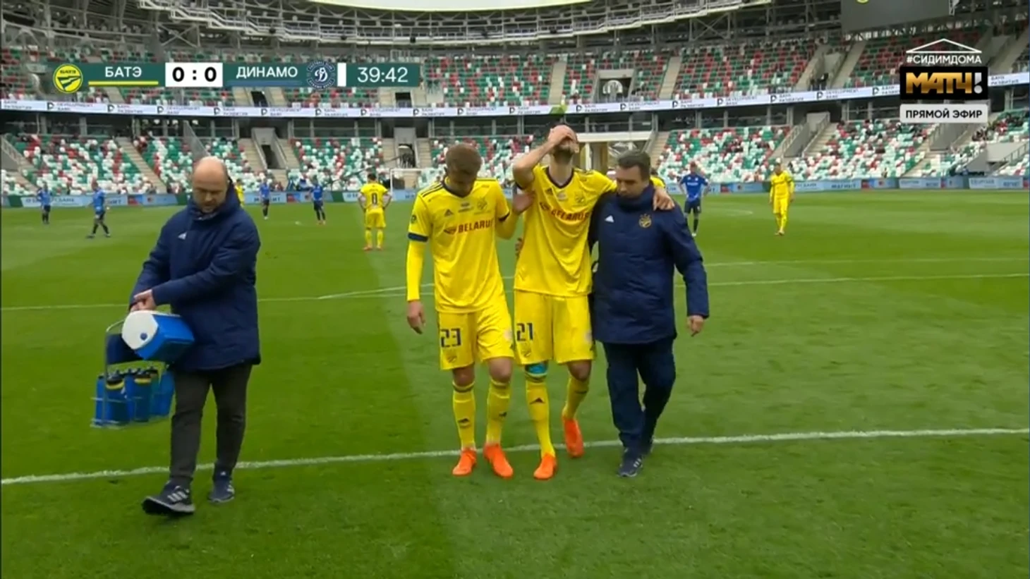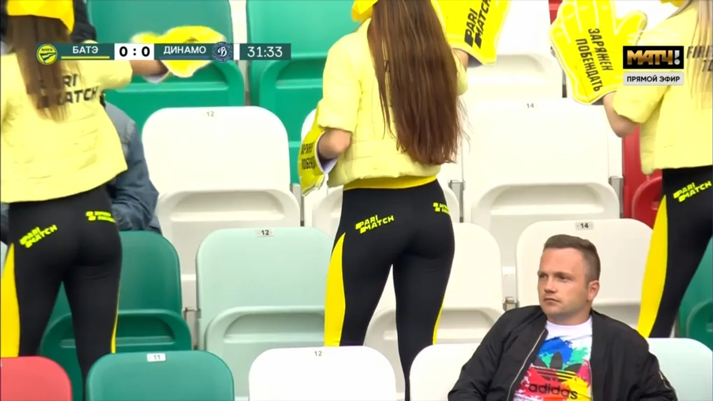 По первым кадрам на стадионе видим огромные дыры на зрительских трибунах. Сначала это разочаровывает, ведь АБФФ выделила лишь около шести тысяч билетов на матч, да еще и рассадила всех в шахматной форме. На деле это совершенно не сказалось на атмосфере. Обычная нормальная футбольная атмосфера с кричалками. Причем явное преимущество было у фанатов из Бреста – постоянно слышалось «Динамо!». А борисовчан слышно вообще не было. Странно как-то.